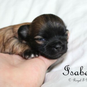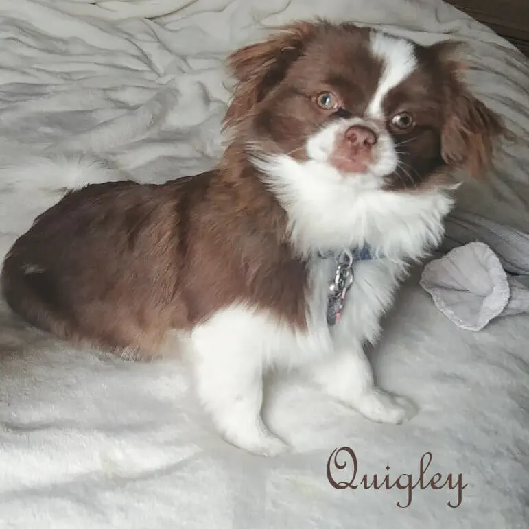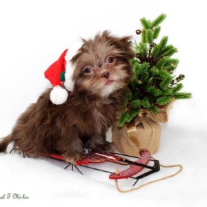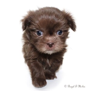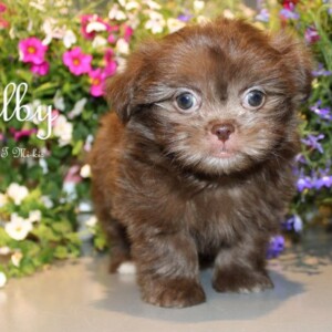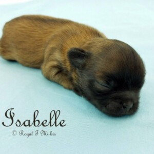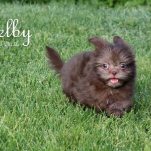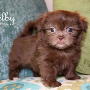 The chocolate gene is a recessive trait that turns the black pigment brown in both the coat and the skin. Therefore, chocolate Mi-Kis will have brown nose leathers, paw pads, and eye rims instead of black. A brown Mi-Ki that has a black nose is not considered chocolate. Additionally, chocolate Mi-Kis will have amber-colored eyes. Chocolate can also be modified by the graying gene to turn into a beautiful taupe color like Truffle. Chocolates can be sable, brindle, and clear red. They can also be spotted. Chocolate Mi-Kis are popular possibly for the human-like expressions that the lighter skin pigment produces.