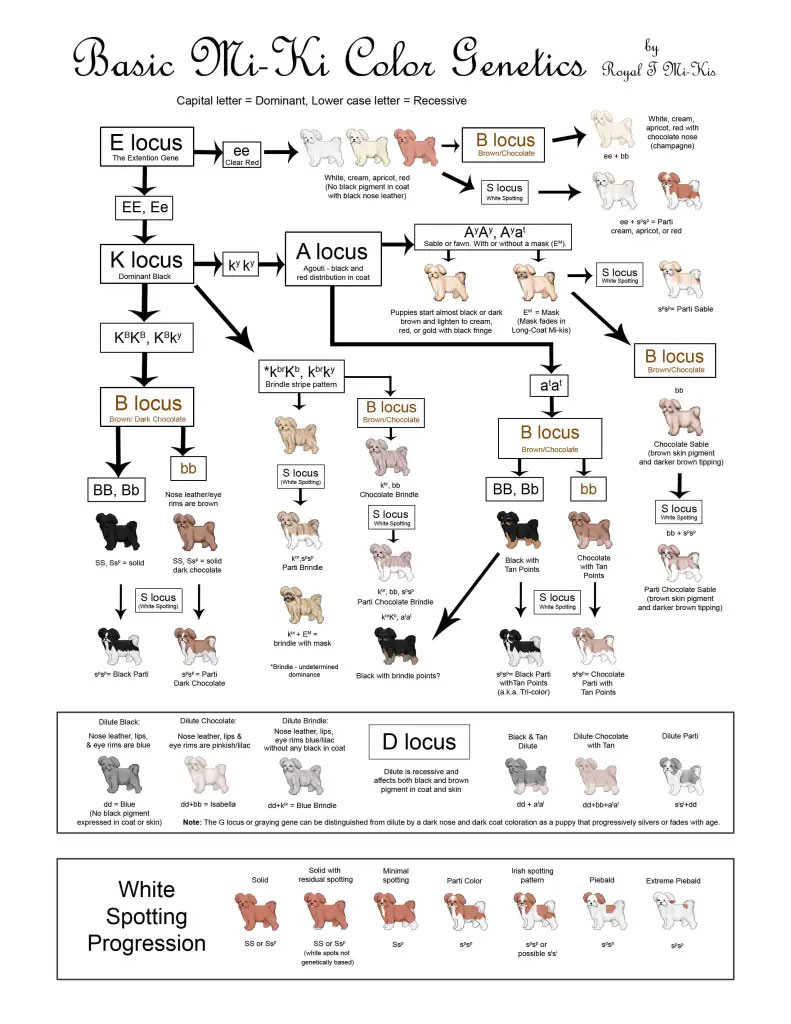 For those of you who are dog nerds like me, I’ve created a little flowchart of Mi-Ki Color Genetics. It’s a work in progress, but I’ll just leave it here for you to peruse. I hope to delve into color genetics in a blog to explain what these letters all mean one day soon.