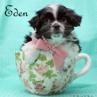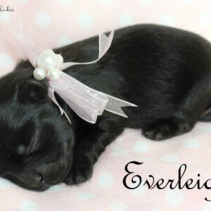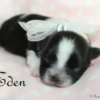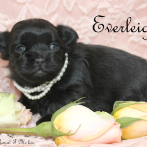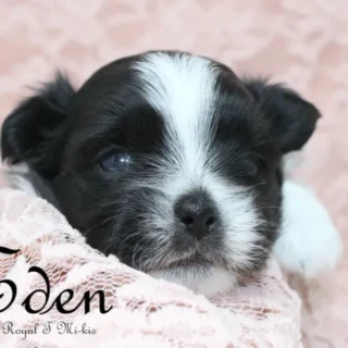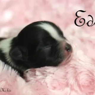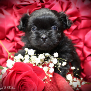 It’s uncommon for black Mi-Kis to stay black. They tend to silver as adults because of the graying gene, which is dominant. We have a rare black line that stays black thanks to Belle Amie’s Sinbad. His coat is a beautiful glossy black that he has passed down to his offspring and can be seen in his great-grand puppies. We first crossed Sinbad to our dark chocolate Savannah and have kept two of their daughters (Eden and Everleigh) who produce dark chocolates and beautiful black puppies. Black Mi-Kis can be solid, have tuxedo coloring with a white chest, paws, and chin, or be splashy particolored.