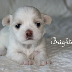 With brindles, you never, know what you will get as they mature. Brindle long-coat Mi-Kis tend to have more of a mottled appearance and vary greatly in color. They may have dark masks or may be particolored (white spotted.) It is easier to see the brindle banding on smooth-coat Mi-Kis as adults than on long-coat Mi-Kis.
