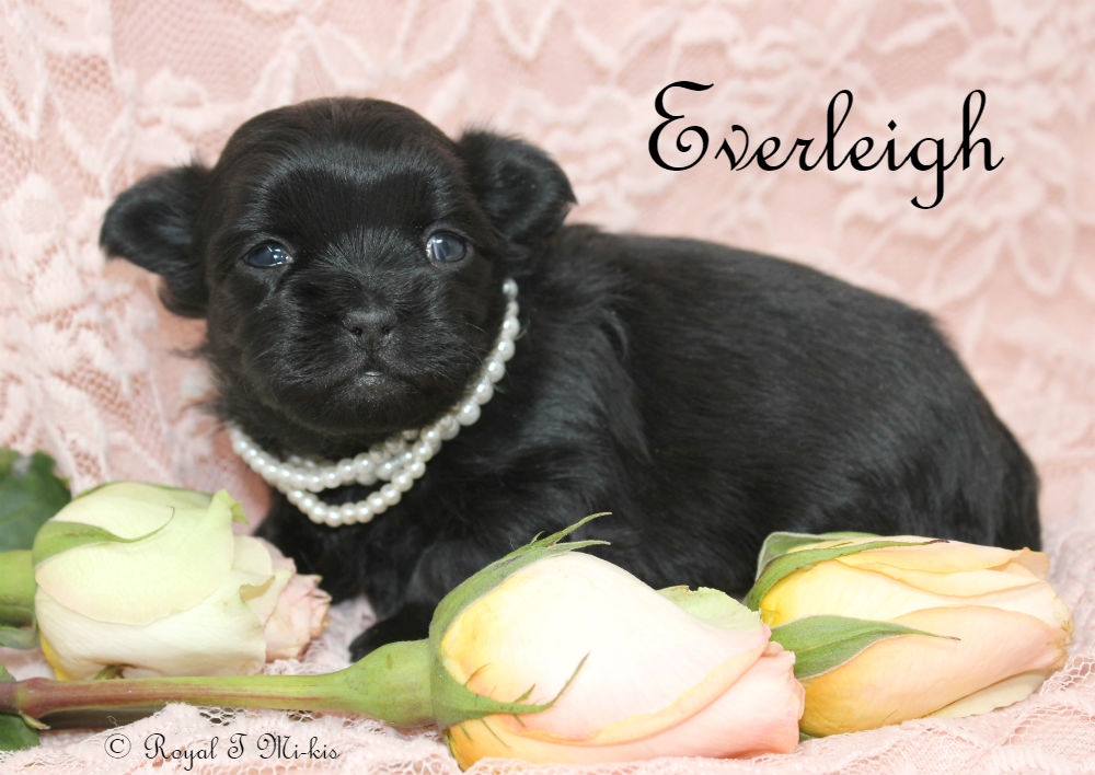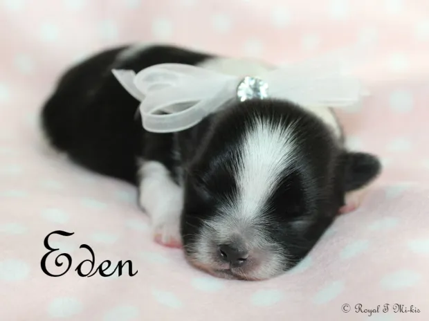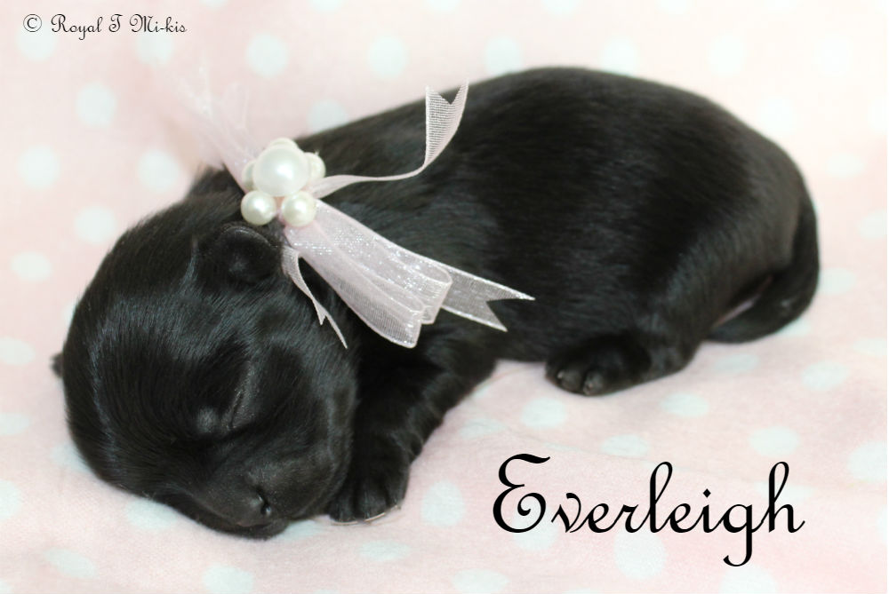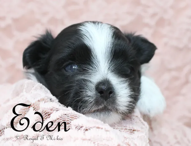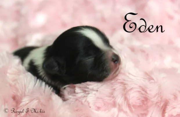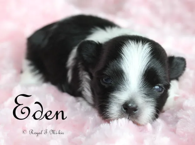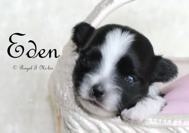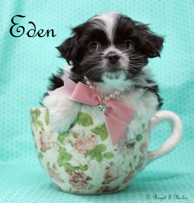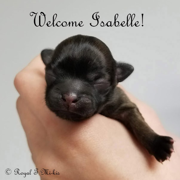 It’s uncommon for black Mi-Kis to stay black. They tend to silver as adults because of the graying gene, which is dominant. We have a rare black line that stays black thanks to Belle Amie’s Sinbad. His coat is a beautiful glossy black that he has passed down to his offspring and can be seen in his great-grand puppies. We first crossed Sinbad to our dark chocolate Savannah and have kept two of their daughters (Eden and Everleigh) who produce dark chocolates and beautiful black puppies. Black Mi-Kis can be solid, have tuxedo coloring with a white chest, paws, and chin, or be splashy particolored.