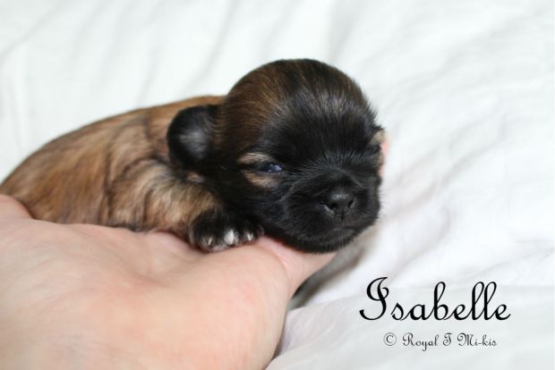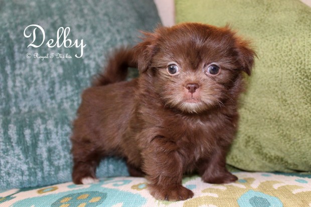 The chocolate gene is a recessive trait that turns the black pigment brown in both the coat and the skin. Therefore, chocolate Mi-Kis will have brown nose leathers, paw pads, and eye rims instead of black. A brown Mi-Ki that has a black nose is not considered chocolate. Additionally, chocolate Mi-Kis will have amber-colored eyes. Chocolate can also be modified by the graying gene to turn into a beautiful taupe color like Truffle. Chocolates can be sable, brindle, and clear red. They can also be spotted. Chocolate Mi-Kis are popular possibly for the human-like expressions that the lighter skin pigment produces.