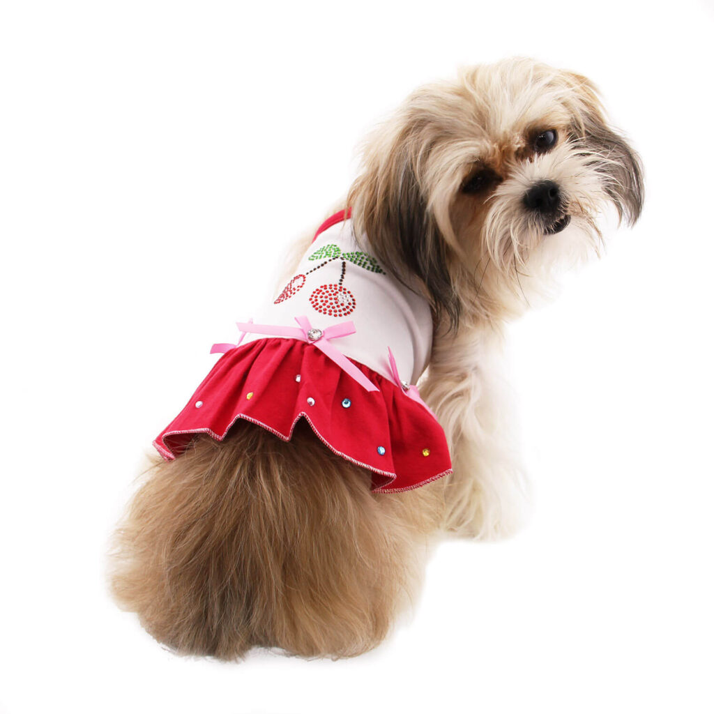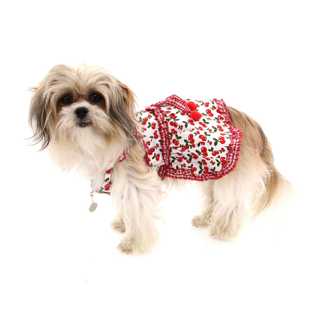 We also love cherry-themed dog dresses for Valentine’s Day. Here Evie models some of our favorites by Klippo and Pooch Outfitters.