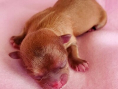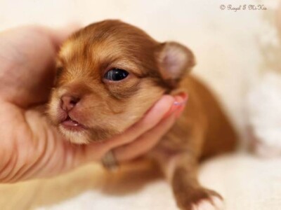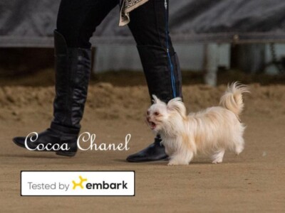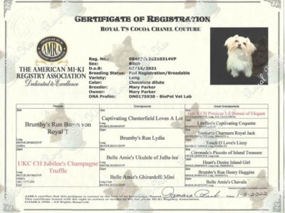 Chai was acquired from Cindy Brugh of My Little Puppy Paws in Michigan at the request of Tamara Beebe, the AMRA registrar to preserve some of her old breeding lines. My Little Cup o’ Chai Royal T is a pretty little 4-pound clear red (cream and white) from a rare Mi-Ki line we’re helping to maintain. Despite her small size, she has had an easy time birthing her litters and is a great little mamma! She had perfect OFA screenings and an Embark DNA test. Chai recently showed very well at the 2022 Mi-Ki specialty with IABCA. She earned her national and international championship titles (applications pending) and high placements including Best of Breed, and a Group 3 in the Toy category. Chai’s legacy continues with her son Harley and several grandchildren that are in our breeding program and others’. These include Yohanna, Nilla, Halen, and great-granddaughter Chaina.