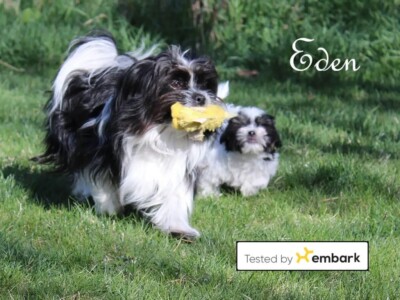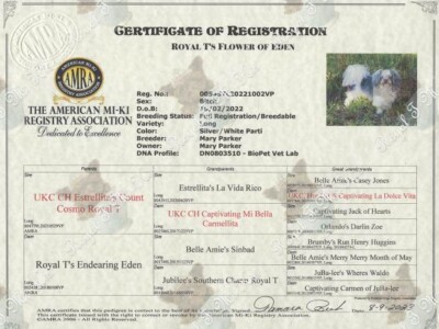 Everleigh produced beautiful puppies for both Jubilee Mi-Kis and us! Her legacy continues through her daughters Tootsie, Echo, Umber, and Minnie. Her son Mushu is a stud for TLC Mi-Kis. She is enjoying retirement in Texas with another Royal T Mi-Ki. Savannah and Sinbad are her parents, and Eden is her littermate.