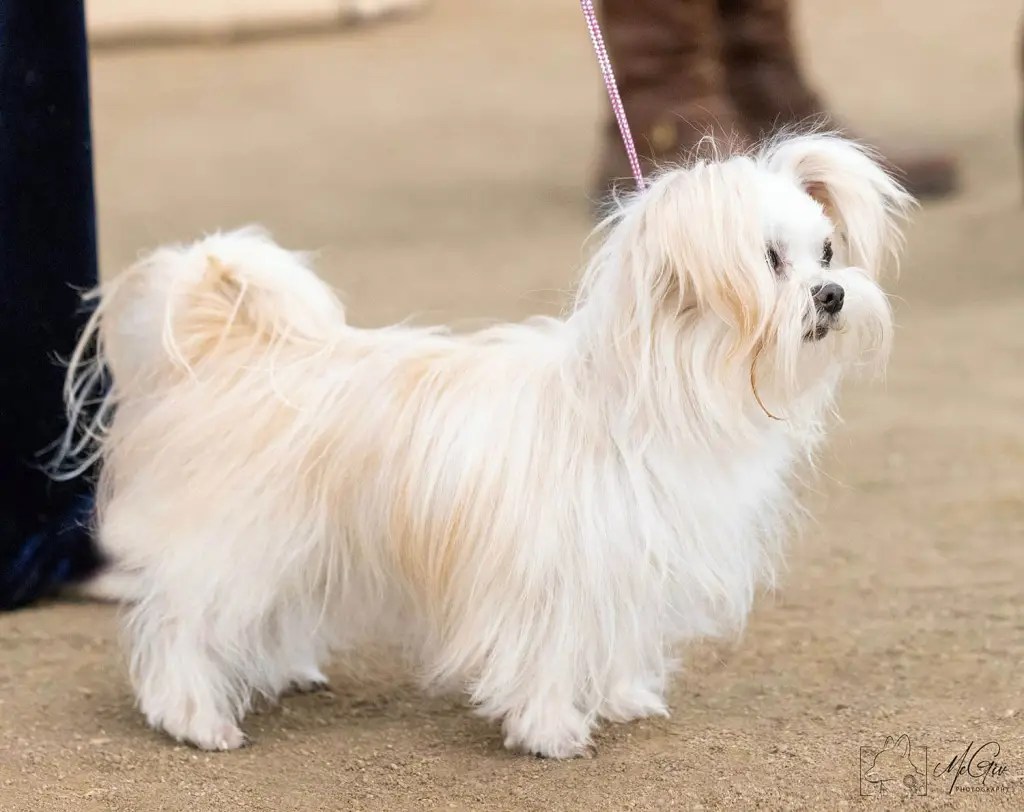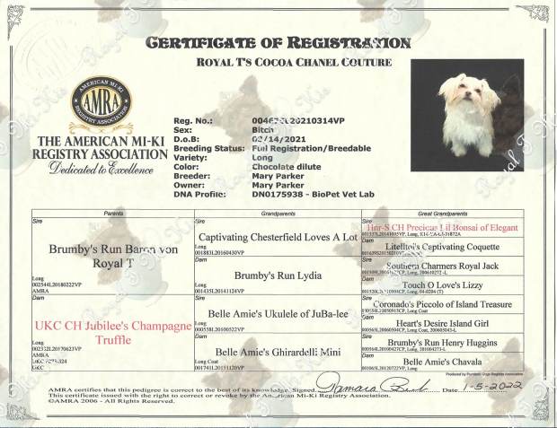 Chai was acquired from Cindy Brugh of My Little Puppy Paws in Michigan at the request of Tamara Beebe, the AMRA registrar to preserve some of her old breeding lines. My Little Cup o’ Chai Royal T is a pretty little 4-pound clear red (cream and white) from a rare Mi-Ki line we’re helping to maintain. Despite her small size, she has had an easy time birthing her litters and is a great little mamma! She had perfect OFA screenings and an Embark DNA test. Chai recently showed very well at the 2022 Mi-Ki specialty with IABCA. She earned her national and international championship titles (applications pending) and high placements including Best of Breed, and a Group 3 in the Toy category. Chai’s legacy continues with her son Harley and several grandchildren that are in our breeding program and others’. These include Yohanna, Nilla, Halen, and great-granddaughter Chaina.