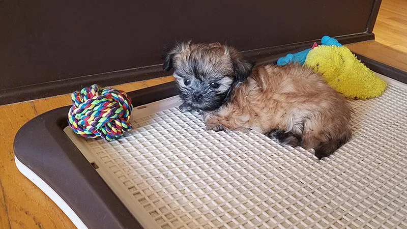 We recommend potty pad holders with grate covers to keep your Mi-Ki from shredding the potty pads! (This was Isabelle as a tiny puppy)